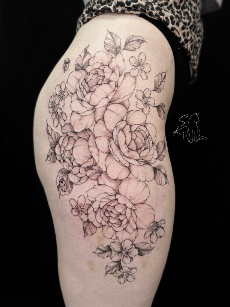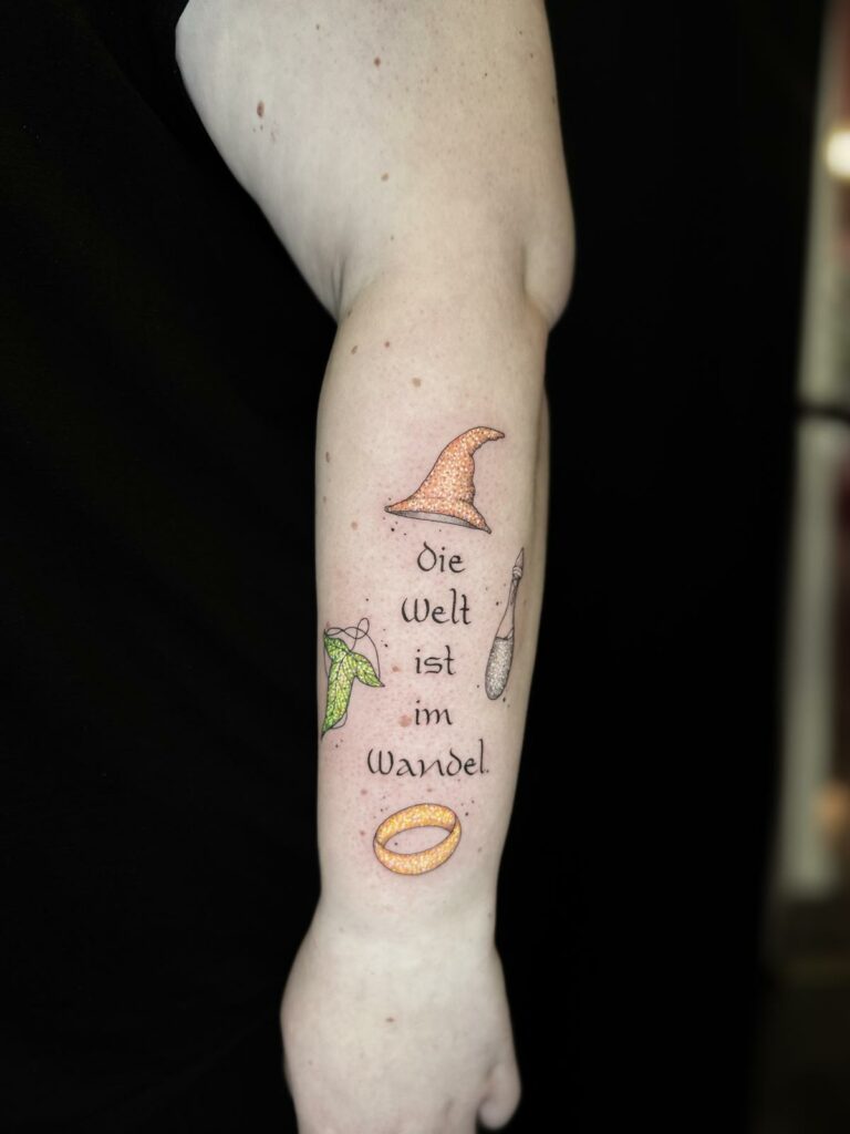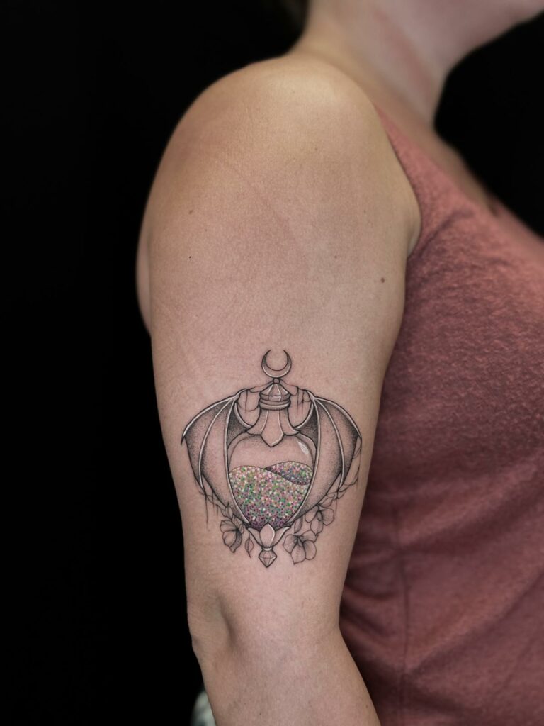 Am liebsten tätowiert das sympathische Pferdemädchen Harry Potter Motive oder alles, was filigran, feminin oder geometrisch ist. Eine besondere Spezialität sind ihre Glitzertattoos, bei denen unzählige bunte Punkte einen Glitzereffekt in die Tätowierung zaubern.